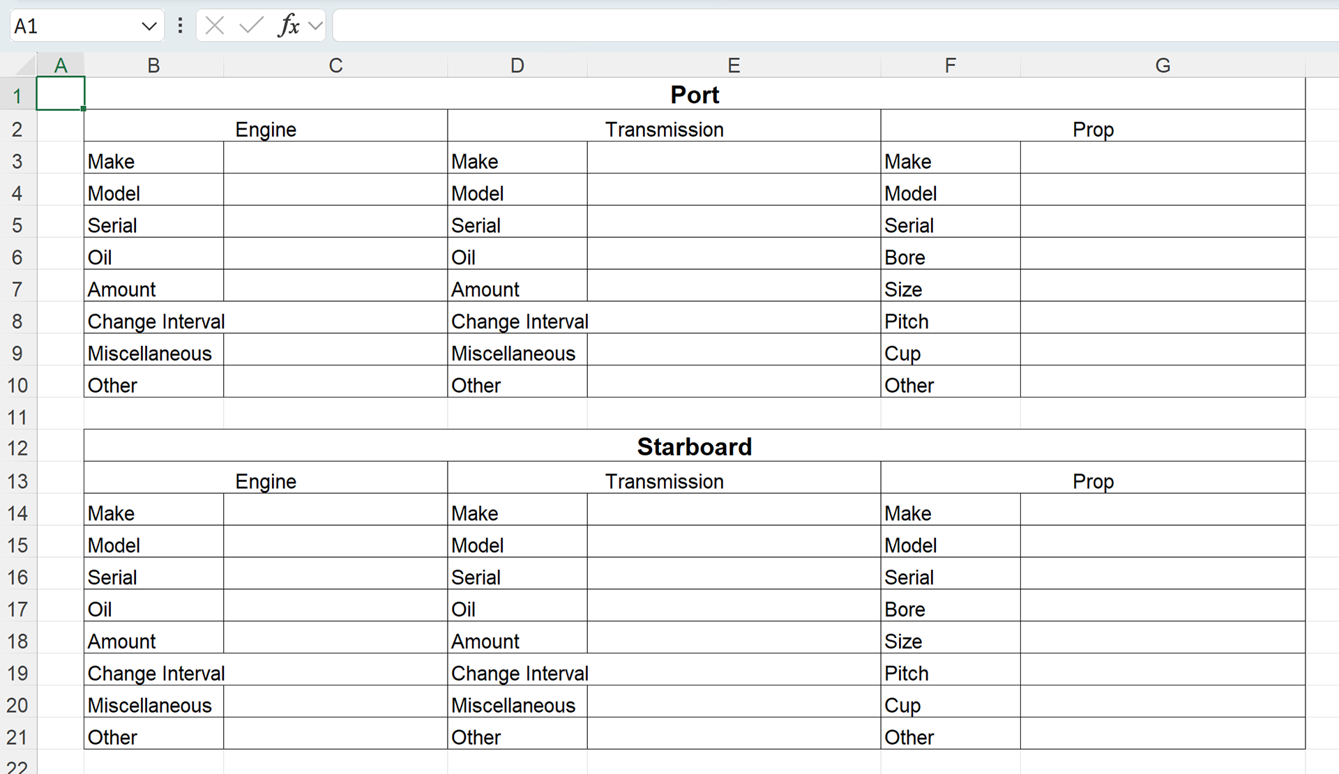 The remaining sheets are to collect and store information about your boat like, engine serials numbers, oil capacities, tank specification and other information you may need or want to keep track of.